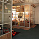 - Large interior sliding glass panels separating the classrooms